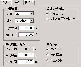 變化初值:變化初值是前面所設(shè)置好的諧波的值。初值是從前頁的諧波數(shù)據(jù)頁面中取來的,不能直接修改。要修改這個初值須在諧波數(shù)據(jù)頁面里進行。初值在這里以幅值的方式表示。
