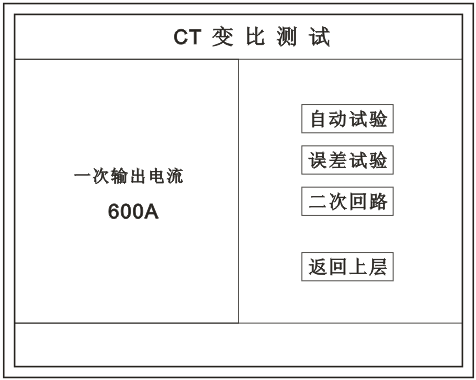 在主菜單界面,旋轉(zhuǎn)鼠標(biāo)將光標(biāo)移動到 CT測試 選項上,按下旋轉(zhuǎn)鼠標(biāo)選擇 CT變比 即可進(jìn)入變比極性試驗(yàn)設(shè)置界面(如下圖)。光標(biāo)移動至 返回上層 ,按下鼠標(biāo)即可返回主菜單。