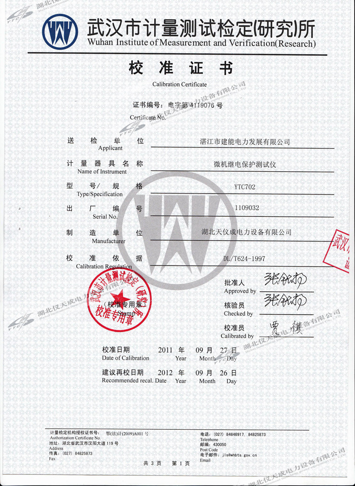 轉(zhuǎn)載:"YTC702微機(jī)繼電保護(hù)測試儀的資質(zhì)證書" 請注明來源于儀天成電力。 更多技術(shù)問題請致電儀天成電力客戶服務(wù):027-87876585,技術(shù)部專線:027-87876585,在線客服:719388481