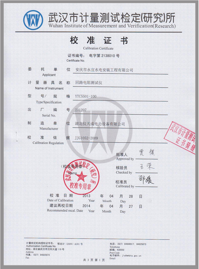 轉(zhuǎn)載:"YTC5501回路電阻測試儀鑒定證書" 請注明來源于儀天成電力。 更多技術(shù)問題請致電儀天成電力客戶服務(wù):027-87876585,技術(shù)部專線:027-87876585,在線客服: